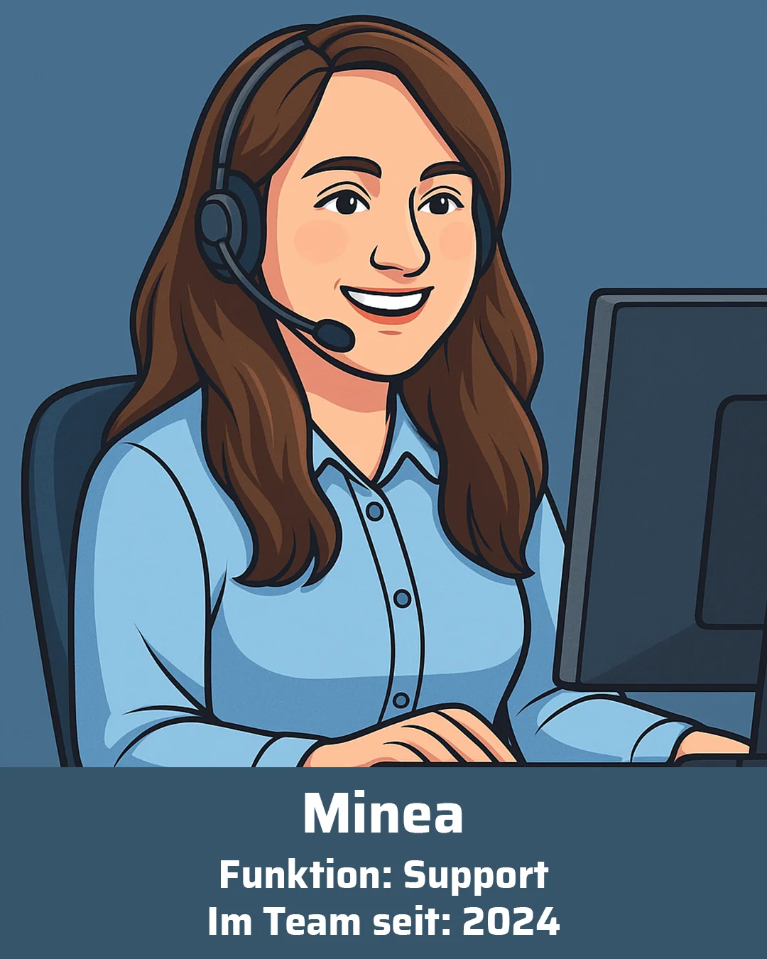 Ich bin Minea, nach meiner kaufmännischen Ausbildung war ich in verschiedenen Bereichen im Büro tätig, unter anderem auch in Handwerksbetrieben. Daher freue ich mich, Ihnen bei Ihren Anliegen und Fragen mit Rat und Tat und den Erfahrungen, die ich bereits sammeln durfte, zur Seite zu stehen.