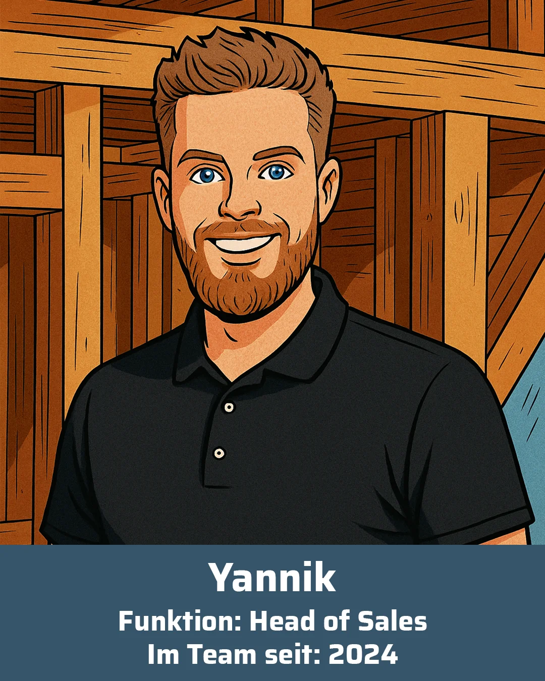 Ich bin Yannik Tuschak, ausgebildeter Zimmermann, Holztechniker und Experte im Bereich Marketing & Sales. Als neues Teammitglied stehe ich für alle Fragen rund um die App zur Verfügung und entwickle mich Schritt für Schritt weiter Richtung Marketing und Vertrieb, um hier meine Erfahrung aus Handwerk und Büro teilen zu können.